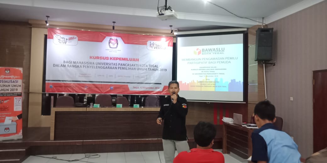 Tegal, Badan Pengawas Pemilihan Umum - Ketua Bawaslu Kota Tegal yang juga koordinator Divisi Hukum , Penindakan Pelanggaran dan Penyelesaian Sengketa mengajak mahasiswa untuk melakukan pengawasan partisipatif tahapan pemiluhan umum 2019 sebagai strategi penguatan pengawasan pemilu. Hal tersebut disampaikan saat menjadi pembicara pada hari Senin ( 12 /11/2018 ) di Universitas Pancasakti Kota Tegal .