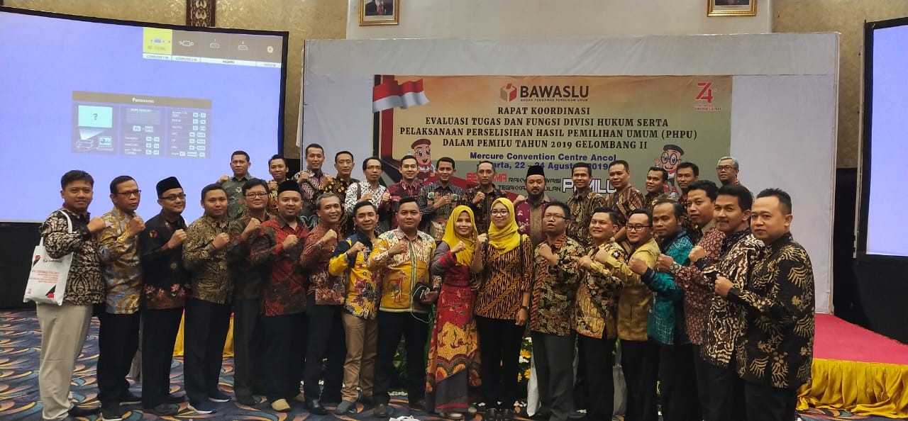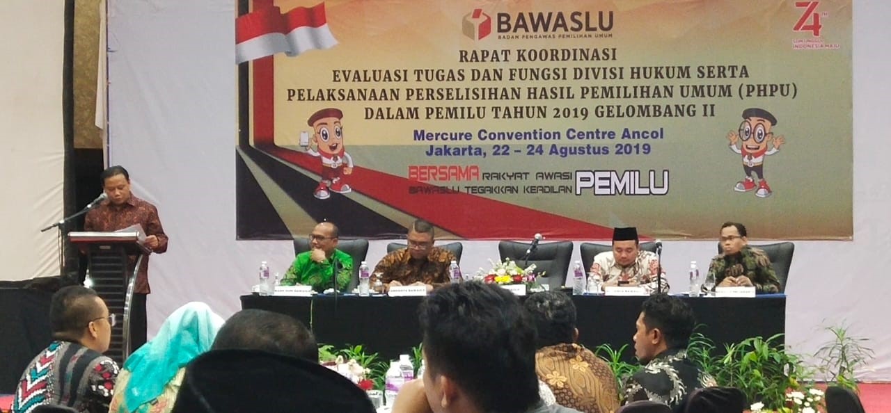 JAKARTA – Badan Pengawas Pemilihan Umum (BAWASLU) RI menggelar Rapat Koordinasi Evaluasi Tugas dan Fungsi Divisi Hukum Data Informasi serta Pelaksanaan Perselisihan Hasil Pemilihan Umum (PHPU) dalam Pemilu Tahun 2019. Pelaksanaan kegiatan dibagi dalam dua tahap dalam waktu yang berurutan dan tempat yang berbeda, gelombang pertama berlangsung pada tanggal 19 s.d. 21 Agustus 2019 bertempat di Icon Hotel and Convention, Bogor dan gelombang kedua dilaksanakan pada tanggal 22 s.d 24 Agustus 2019 digelar di Mercure Hotel and Convention Centre Ancol, Jakarta.