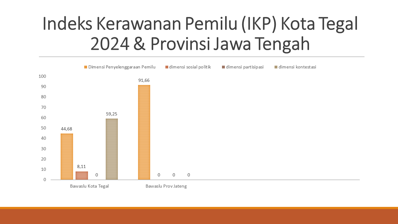Data IKP Bawaslu kota Tegal dari 4 dimensi secara nasional masuk kategori sedang diantaranya dimensi penyelenggaraan pemilu 44,68 dimensi sosial politik 8,11 dimensi partisipasi 0 dimensi kontestasi 59,25, total keseluruhan IKP Kota Tegal 33,98.