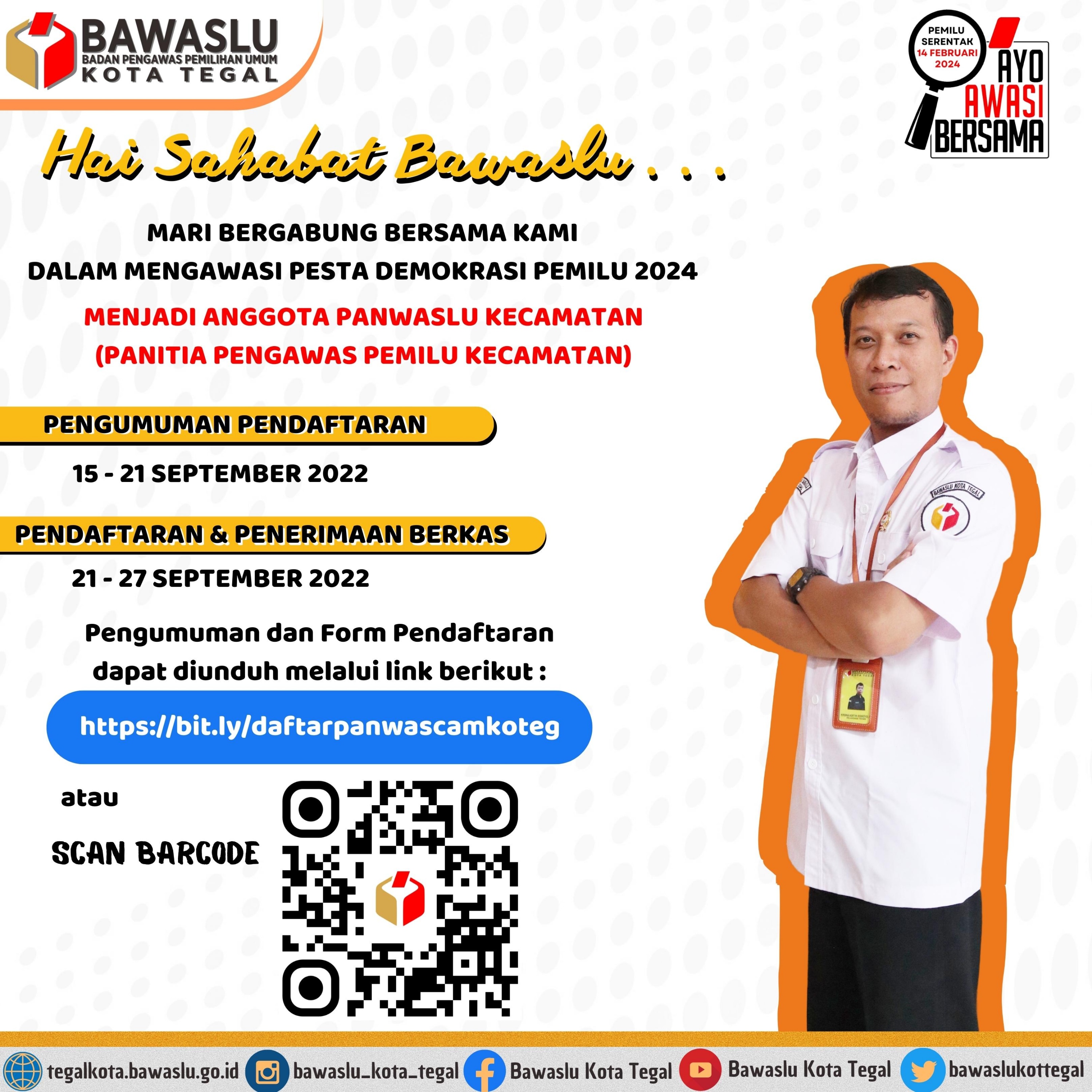 Dalam rangka pembentukan Panwaslu Kecamatan untuk Pemilu serentak tahun 2024, Kelompok Kerja Pembentukan Panwaslu Kecamatan Kota Tegal berdasarkan Peraturan Badan Pengawas Pemilihan Umum Republik Indonesia Nomor 19 Tahun 2017 sebagaimana telah diubah terakhir dengan Peraturan Badan Pengawas Pemilihan Umum Republik Indonesia Nomor 8 Tahun 2019, atas kewenangan yang diberikan oleh Undang-Undang Nomor 7 Tahun 2017, membuka kesempatan bagi Warga Negara Indonesia yang memenuhi persyaratan untuk mendaftarkan diri sebagai calon anggota Panwaslu Kecamatan.