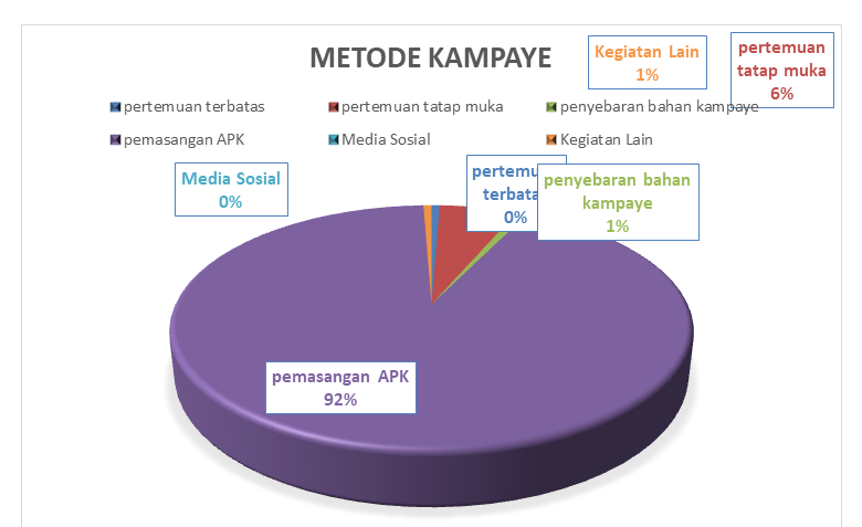Sejak dimulainya masa kampaye hingga sekarang, metode kampaye yang dominan adalah pertemuan tatap muka dan pemasangan alat peraga di tempat umum.